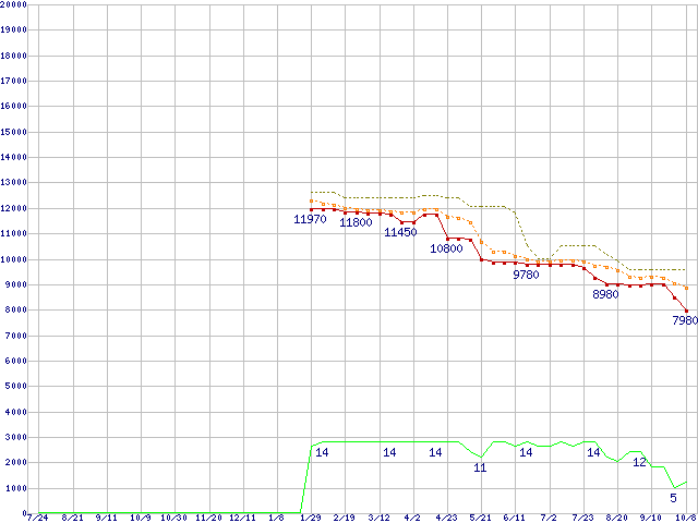 Athlon II X4 635 (2.9GHz,L2 512KB×4,TDP 95W)の価格推移↑前グラフ↓次グラフ(2009年7月24日〜2010年10月8日)※このグラフは過去のデータも税率5%相当に調整した税込み相当額のグラフです。●関連グラフCPU主要製品の最安値推移CPU主要製品(最安値1万円未満)の最安値推移AMD系CPUの最安値推移Socket AM3 (Quad Core)の最安値推移●凡例最安値(点線部は販売店未確認または未調査)平均値最高値ショップ数