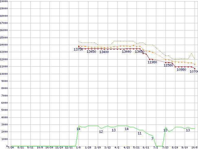 Core i3-540 (3.06GHz)の価格推移↑前グラフ↓次グラフ(2009年7月24日〜2010年10月8日)※このグラフは過去のデータも税率5%相当に調整した税込み相当額のグラフです。●関連グラフCPU主要製品の最安値推移CPU主要製品(最安値1万円〜2万円未満)の最安値推移Intel系CPUの最安値推移LGA1156 (L3キャッシュ4MB,Dual Core,GPU内蔵,Hyper-Threading,TDP 73〜87W)の最安値推移●凡例最安値(点線部は販売店未確認または未調査)平均値最高値ショップ数