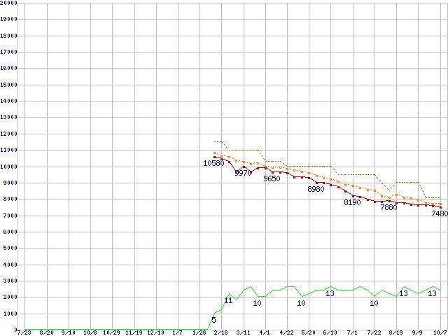 WD1002FAEX (1TB,64MB)の価格推移↑前グラフ↓次グラフ(2009年7月23日〜2010年10月7日)※このグラフは過去のデータも税率5%相当に調整した税込み相当額のグラフです。 税率変更や、総額表示方式導入(2004年4月)の影響は除いています。●関連グラフHDD/SSD主要製品の最安値推移HDD/SSD主要製品(最安値1万円未満)の最安値推移HDD 1TB〜1.5TB未満の最安値推移WD Caviar Black (7200rpm,6Gb/s)の最安値推移●凡例最安値(点線部は販売店未確認または未調査)平均値最高値ショップ数