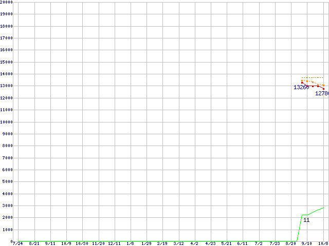 Core i3-560 (3.33GHz)の価格推移↑前グラフ↓次グラフ(2009年7月24日〜2010年10月8日)※このグラフは過去のデータも税率5%相当に調整した税込み相当額のグラフです。●関連グラフCPU主要製品の最安値推移CPU主要製品(最安値1万円〜2万円未満)の最安値推移Intel系CPUの最安値推移LGA1156 (L3キャッシュ4MB,Dual Core,GPU内蔵,Hyper-Threading,TDP 73〜87W)の最安値推移●凡例最安値(点線部は販売店未確認または未調査)平均値最高値ショップ数