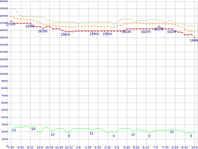 Core 2 Quad Q8400 (2.66GHz,L2 2MB×2)の価格推移↑前グラフ↓次グラフ(2009年7月24日〜2010年10月8日)※このグラフは過去のデータも税率5%相当に調整した税込み相当額のグラフです。●関連グラフCPU主要製品の最安値推移CPU主要製品(最安値1万円〜2万円未満)の最安値推移Intel系CPUの最安値推移LGA775 (FSB 1333MHz,Quad Core,TDP 95W)の最安値推移●凡例最安値(点線部は販売店未確認または未調査)平均値最高値ショップ数