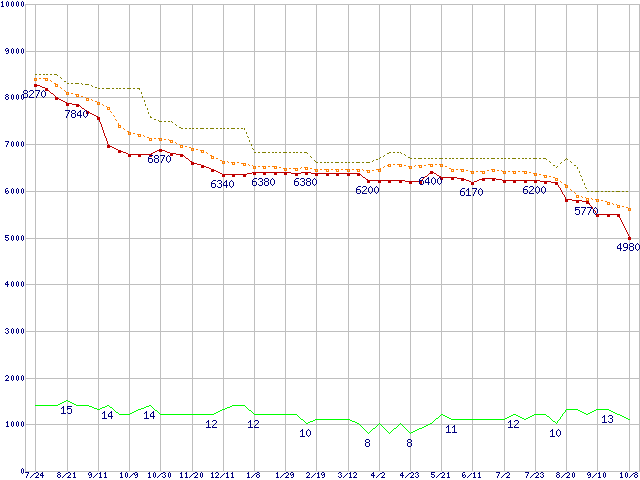 Athlon II X2 250 (3.0GHz,L2 1MB×2,TDP 65W)の価格推移↑前グラフ↓次グラフ(2009年7月24日〜2010年10月8日)※このグラフは過去のデータも税率5%相当に調整した税込み相当額のグラフです。●関連グラフCPU主要製品の最安値推移CPU主要製品(最安値1万円未満)の最安値推移AMD系CPUの最安値推移Socket AM3 (Dual Core)の最安値推移●凡例最安値(点線部は販売店未確認または未調査)平均値最高値ショップ数