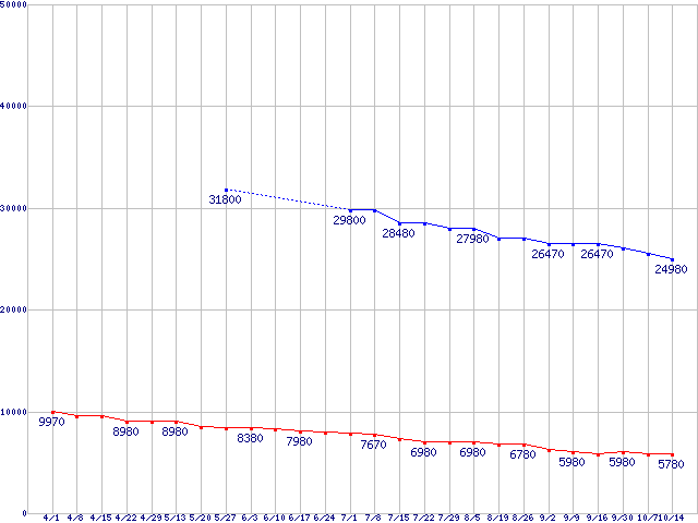 | ※製品名をクリックすると個別のグラフを表示します ※点線部は販売店が確認できなかった、または調査データがないことを示します |