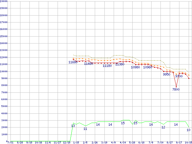 Core i3-530 (2.93GHz)の価格推移↑前グラフ↓次グラフ(2009年7月31日〜2010年10月15日)※このグラフは過去のデータも税率5%相当に調整した税込み相当額のグラフです。●関連グラフCPU主要製品の最安値推移CPU主要製品(最安値1万円未満)の最安値推移Intel系CPUの最安値推移LGA1156 (L3キャッシュ4MB,Dual Core,GPU内蔵,Hyper-Threading,TDP 73〜87W)の最安値推移●凡例最安値(点線部は販売店未確認または未調査)平均値最高値ショップ数