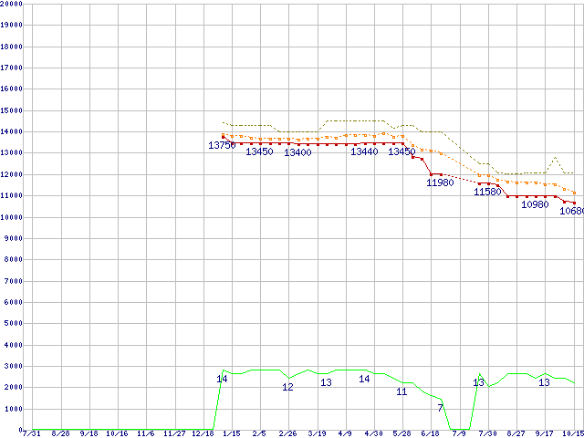Core i3-540 (3.06GHz)の価格推移↑前グラフ↓次グラフ(2009年7月31日〜2010年10月15日)※このグラフは過去のデータも税率5%相当に調整した税込み相当額のグラフです。●関連グラフCPU主要製品の最安値推移CPU主要製品(最安値1万円〜2万円未満)の最安値推移Intel系CPUの最安値推移LGA1156 (L3キャッシュ4MB,Dual Core,GPU内蔵,Hyper-Threading,TDP 73〜87W)の最安値推移●凡例最安値(点線部は販売店未確認または未調査)平均値最高値ショップ数