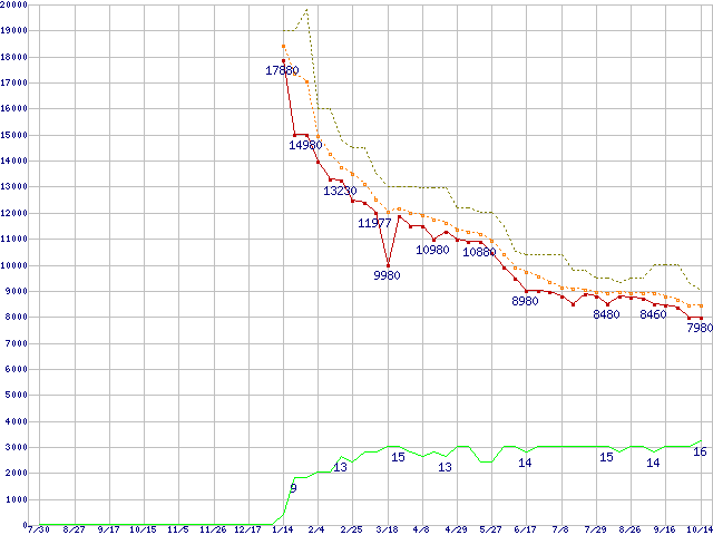 WD20EARS (2TB,64MB)の価格推移↑前グラフ↓次グラフ(2009年7月30日〜2010年10月14日)※このグラフは過去のデータも税率5%相当に調整した税込み相当額のグラフです。 税率変更や、総額表示方式導入(2004年4月)の影響は除いています。●関連グラフHDD/SSD主要製品の最安値推移HDD/SSD主要製品(最安値1万円未満)の最安値推移HDD 2TB以上の最安値推移WD Caviar Green (3Gb/s)の最安値推移●凡例最安値(点線部は販売店未確認または未調査)平均値最高値ショップ数