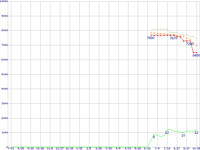 Athlon II X2 245e (2.9GHz,L2 1MB×2,TDP 45W)の価格推移↑前グラフ↓次グラフ(2009年7月31日〜2010年10月15日)※このグラフは過去のデータも税率5%相当に調整した税込み相当額のグラフです。●関連グラフCPU主要製品の最安値推移CPU主要製品(最安値1万円未満)の最安値推移AMD系CPUの最安値推移Socket AM3 (Dual Core)の最安値推移●凡例最安値(点線部は販売店未確認または未調査)平均値最高値ショップ数