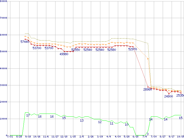 Core i7-870 (2.93GHz)の価格推移↑前グラフ↓次グラフ(2009年7月31日〜2010年10月15日)※このグラフは過去のデータも税率5%相当に調整した税込み相当額のグラフです。●関連グラフCPU主要製品の最安値推移CPU主要製品(最安値2万円〜3万円未満)の最安値推移Intel系CPUの最安値推移LGA1156 (L3キャッシュ8MB,Quad Core,Hyper-Threading,TDP 82〜95W)の最安値推移●凡例最安値(点線部は販売店未確認または未調査)平均値最高値ショップ数