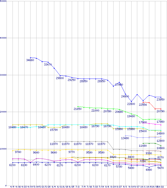 AMD系CPUの最安値推移↑前グラフ↓次グラフ(2010年4月9日〜2010年10月22日)※このグラフは過去のデータも税率5%相当に調整した税込み相当額のグラフです。凡例Phenom II X6 1090T Black Edition (3.2GHz,L2 512KB×6,L3 6MB,TDP 125W)Phenom II X6 1075T (3.0GHz,L2 512KB×6,L3 6MB,TDP 125W)Phenom II X6 1055T (2.8GHz,L2 512KB×6,L3 6MB,TDP 95W)Phenom II X4 970 Black Edition (3.5GHz,L2 512KB×4,L3 6MB,TDP 125W)Phenom II X4 910e (2.6GHz,L2 512KB×4,L3 6MB,TDP 65W)Phenom II X4 965 Black Edition (3.4GHz,L2 512KB×4,L3 6MB,TDP 125W)Phenom II X4 955 (3.2GHz,L2 512KB×4,L3 6MB,TDP 95W)Athlon II X4 615e (2.5GHz,L2 512KB×4,TDP 45W)Athlon II X4 645 (3.1GHz,L2 512KB×4,TDP 95W)Phenom II X2 560 Black Edition (3.3GHz,L2 512KB×2,L3 6MB)Athlon II X4 640 (3.0GHz,L2 512KB×4,TDP 95W)Phenom II X2 555 Black Edition (3.2GHz,L2 512KB×2,L3 6MB)Athlon II X2 250e (3.0GHz,L2 1MB×2,TDP 45W)Athlon II X3 445 (3.1GHz,L2 512KB×3,TDP 95W)Athlon II X2 265 (3.3GHz,L2 1MB×2,TDP 65W)Athlon II X2 245e (2.9GHz,L2 1MB×2,TDP 45W)Athlon II X2 260 (3.2GHz,L2 1MB×2,TDP 65W)Athlon II X2 255 (3.1GHz,L2 1MB×2,TDP 65W)Athlon II X2 240e (2.8GHz,L2 1MB×2,TDP 45W)Athlon II X2 250 (3.0GHz,L2 1MB×2,TDP 65W)※製品名をクリックすると個別のグラフを表示します※点線部は販売店が確認できなかった、または調査データがないことを示します