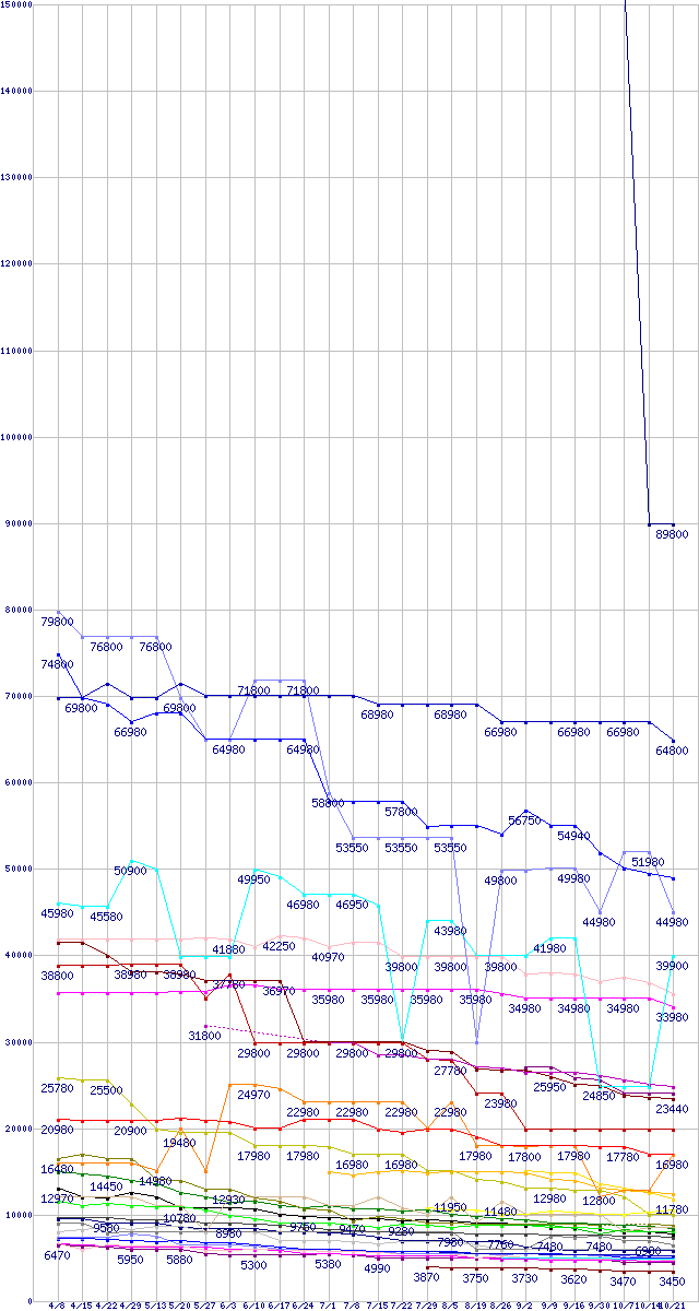 HDD/SSD主要製品の最安値推移↑前グラフ↓次グラフ(2010年4月8日〜2010年10月21日)※このグラフは過去のデータも税率5%相当に調整した税込み相当額のグラフです。 税率変更や、総額表示方式導入(2004年4月)の影響は除いています。凡例その他2.5インチSSD 512GB (512GB,MLC)SSDSA2SH064G1C5 (64GB,SLC)CTFDDAC256MAG-1G1 (256GB,MLC)2.5インチSSD(SandForce製コントローラ) (200〜240GB,MLC)その他2.5インチSSD 256GB (256GB,MLC)X25-M(G2) (160GB,MLC)SSDSA2SH032G1 (32GB,SLC)WD6000HLHX (600.0GB)Real SSD C300 Micron純正/OEM品 (128GB,MLC)CTFDDAC128MAG-1G1 (128GB,MLC)2.5インチSSD(SandForce製コントローラ) (100〜120GB,MLC)X25-M(G2) (80GB,MLC)その他2.5インチSSD 128GB (128GB,MLC)CTFDDAC064MAG-1G1 (64GB,MLC)Real SSD C300 Micron純正/OEM品 (64GB,MLC)0S02602(純正パッケージ品) (2TB,32MB)2.5インチSSD(SandForce製コントローラ) (50〜60GB,MLC)WD10TPVT (1TB,8MB,12.5mm厚)その他2.5インチSSD 64GB (64GB,MLC)ST32000542AS (2TB,32MB)HD204UI (2TB,32MB)WD20EARS (2TB,64MB)WD7500BPVT (750GB,8MB)WD1002FAEX (1TB,64MB)その他2.5インチSSD 32GB (32GB,MLC)WD15EARS (1.5TB,64MB)WD6400BPVT (640GB,8MB)0S02601(純正パッケージ品) (1TB,32MB)ST31000528AS (1TB,32MB)WD10EALS (1TB,32MB)ST31000520AS (1TB,32MB)WD10EARS (1TB,64MB)WD5000BEVT (500GB,8MB)0S02598 (500GB,8MB)HTS545050B9A300 (500GB,8MB)0S02600(純正パッケージ品) (500GB,16MB)※製品名をクリックすると個別のグラフを表示します※点線部は販売店が確認できなかった、または調査データがないことを示します