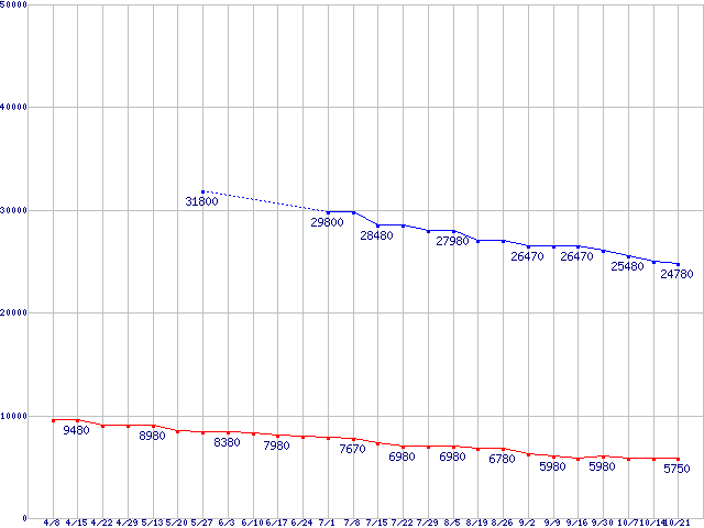 | ※製品名をクリックすると個別のグラフを表示します ※点線部は販売店が確認できなかった、または調査データがないことを示します |