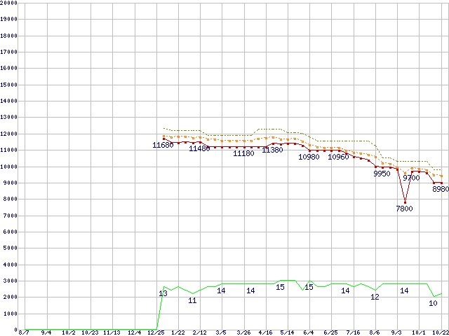 Core i3-530 (2.93GHz)の価格推移↑前グラフ↓次グラフ(2009年8月7日〜2010年10月22日)※このグラフは過去のデータも税率5%相当に調整した税込み相当額のグラフです。●関連グラフCPU主要製品の最安値推移CPU主要製品(最安値1万円未満)の最安値推移Intel系CPUの最安値推移LGA1156 (L3キャッシュ4MB,Dual Core,GPU内蔵,Hyper-Threading,TDP 73〜87W)の最安値推移●凡例最安値(点線部は販売店未確認または未調査)平均値最高値ショップ数