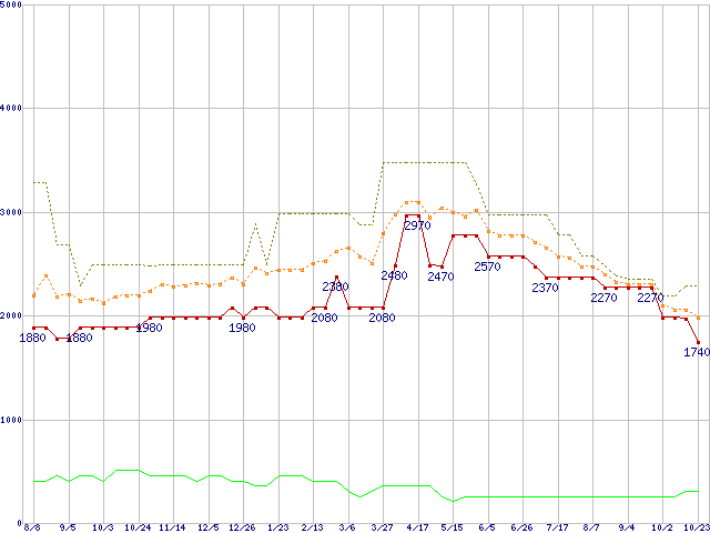 PC3-10600 1GBの価格推移↓次グラフ(2009年8月8日〜2010年10月23日)※このグラフは過去のデータも税率5%相当に調整した税込み相当額のグラフです。 税率変更や、総額表示方式導入(2004年4月)の影響は除いています。●関連グラフメモリ主要製品の最安値推移1GBモジュールの最安値推移メモリ主要製品(最安値5千円未満)の最安値推移PC3-10600(DDR3-1333) DDR3 SDRAM DIMMの最安値推移●凡例最安値(点線部は販売店未確認または未調査)平均値最高値ショップ数