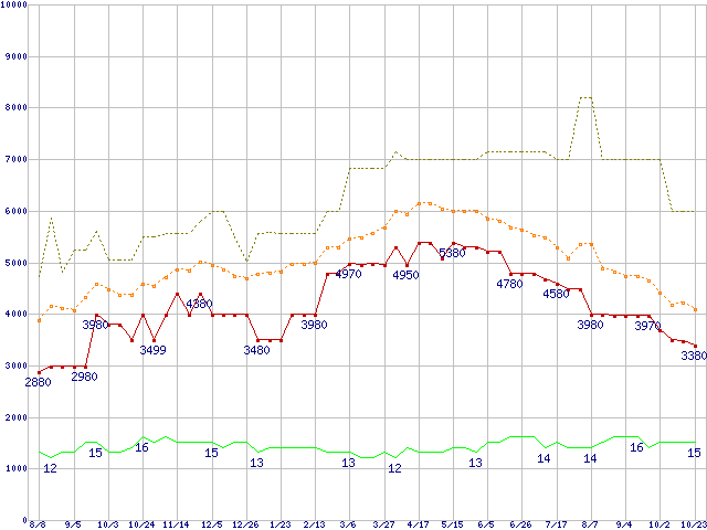 PC3-10600 1GB×2枚組みセットの価格推移↑前グラフ↓次グラフ(2009年8月8日〜2010年10月23日)※このグラフは過去のデータも税率5%相当に調整した税込み相当額のグラフです。 税率変更や、総額表示方式導入(2004年4月)の影響は除いています。●関連グラフメモリ主要製品の最安値推移2GBモジュール/1GBモジュール×2枚の最安値推移メモリ主要製品(最安値5千円未満)の最安値推移PC3-10600(DDR3-1333) DDR3 SDRAM DIMMの最安値推移●凡例最安値(点線部は販売店未確認または未調査)平均値最高値ショップ数
