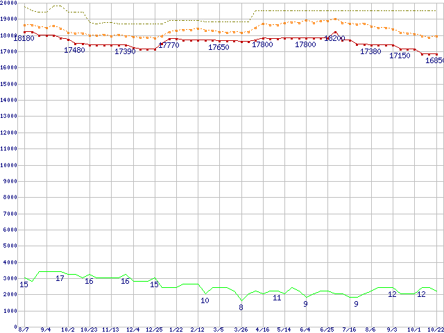 Core 2 Duo E8500 (3.16GHz,L2 6MB)の価格推移↑前グラフ↓次グラフ(2009年8月7日〜2010年10月22日)※このグラフは過去のデータも税率5%相当に調整した税込み相当額のグラフです。●関連グラフCPU主要製品の最安値推移CPU主要製品(最安値1万円〜2万円未満)の最安値推移Intel系CPUの最安値推移LGA775 (FSB 1333MHz,Dual Core,TDP 65W)の最安値推移●凡例最安値(点線部は販売店未確認または未調査)平均値最高値ショップ数