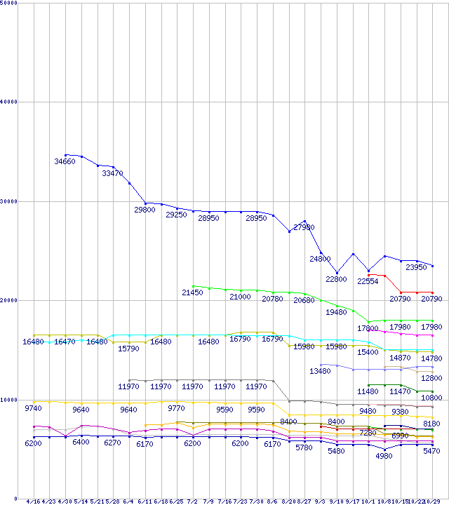 AMD系CPUの最安値推移↑前グラフ↓次グラフ(2010年4月16日〜2010年10月29日)※このグラフは過去のデータも税率5%相当に調整した税込み相当額のグラフです。凡例Phenom II X6 1090T Black Edition (3.2GHz,L2 512KB×6,L3 6MB,TDP 125W)Phenom II X6 1075T (3.0GHz,L2 512KB×6,L3 6MB,TDP 125W)Phenom II X6 1055T (2.8GHz,L2 512KB×6,L3 6MB,TDP 95W)Phenom II X4 970 Black Edition (3.5GHz,L2 512KB×4,L3 6MB,TDP 125W)Phenom II X4 910e (2.6GHz,L2 512KB×4,L3 6MB,TDP 65W)Phenom II X4 965 Black Edition (3.4GHz,L2 512KB×4,L3 6MB,TDP 125W)Phenom II X4 955 (3.2GHz,L2 512KB×4,L3 6MB,TDP 95W)Athlon II X4 615e (2.5GHz,L2 512KB×4,TDP 45W)Athlon II X4 645 (3.1GHz,L2 512KB×4,TDP 95W)Phenom II X2 560 Black Edition (3.3GHz,L2 512KB×2,L3 6MB)Athlon II X4 640 (3.0GHz,L2 512KB×4,TDP 95W)Phenom II X2 555 Black Edition (3.2GHz,L2 512KB×2,L3 6MB)Athlon II X2 250e (3.0GHz,L2 1MB×2,TDP 45W)Athlon II X3 445 (3.1GHz,L2 512KB×3,TDP 95W)Athlon II X2 265 (3.3GHz,L2 1MB×2,TDP 65W)Athlon II X2 245e (2.9GHz,L2 1MB×2,TDP 45W)Athlon II X2 260 (3.2GHz,L2 1MB×2,TDP 65W)Athlon II X2 255 (3.1GHz,L2 1MB×2,TDP 65W)Athlon II X2 240e (2.8GHz,L2 1MB×2,TDP 45W)Athlon II X2 250 (3.0GHz,L2 1MB×2,TDP 65W)※製品名をクリックすると個別のグラフを表示します※点線部は販売店が確認できなかった、または調査データがないことを示します
