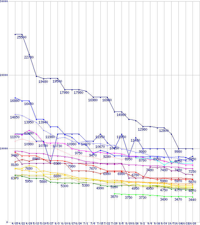 | HDD/SSD主要製品(最安値1万円未満)の最安値推移 |