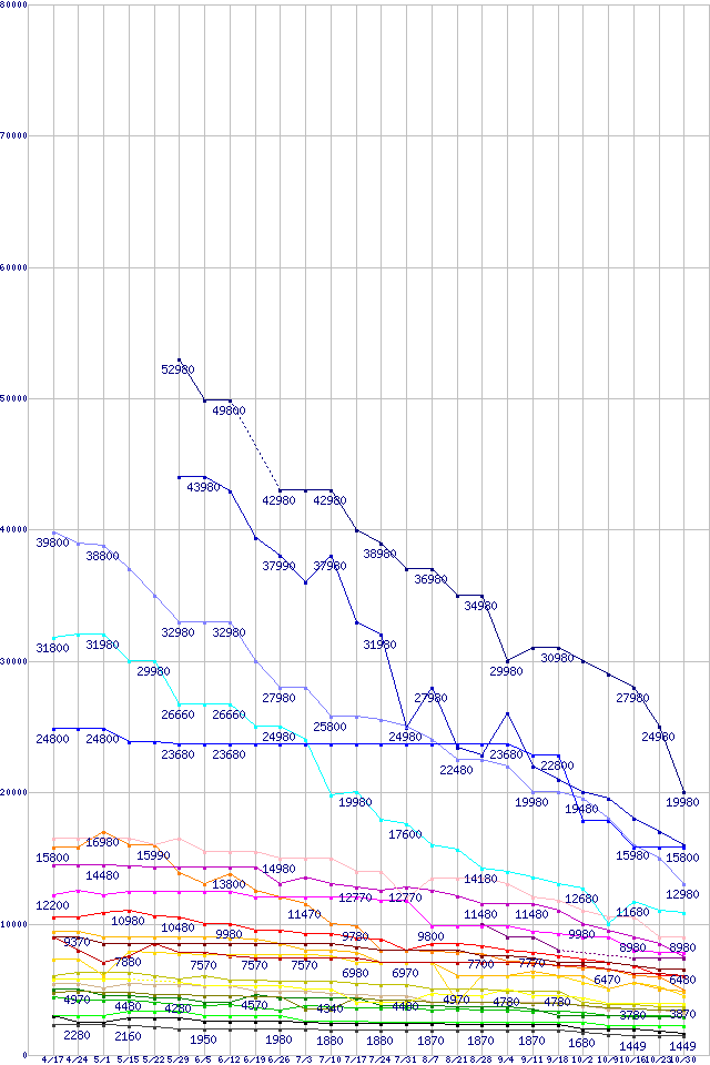 メモリ主要製品の最安値推移↑前グラフ↓次グラフ(2010年4月17日〜2010年10月30日)※このグラフは過去のデータも税率5%相当に調整した税込み相当額のグラフです。 税率変更や、総額表示方式導入(2004年4月)の影響は除いています。凡例PC3-12800 4GB×3枚組みセットPC3-10600 4GB×3枚組みセットPC2-6400 4GB×2枚組みセットPC3-12800 4GB×2枚組みセットPC3-10600 4GB×2枚組みセットPC3-12800 2GB×3枚組みセットPC2-6400 4GBPC3-10600 2GB×3枚組みセットPC3-12800 4GBPC3-12800 1GB×3枚組みセットPC2-6400 2GB×2枚組みセットPC3-12800 2GB×2枚組みセットPC3-10600 4GBPC3-10600 2GB×2枚組みセットPC3-10600 1GB×3枚組みセットPC3-12800 2GBPC3-12800 1GB×2枚組みセットPC2-6400 1GB×2枚組みセットPC3-10600 1GB×2枚組みセットPC3-10600 2GBPC2-6400 2GBPC3-12800 1GBPC3-10600 1GBPC2-6400 1GB※製品名をクリックすると個別のグラフを表示します※点線部は販売店が確認できなかった、または調査データがないことを示します