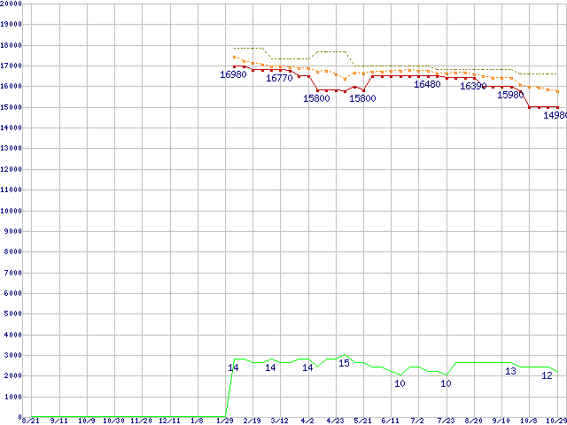 Phenom II X4 910e (2.6GHz,L2 512KB×4,L3 6MB,TDP 65W)の価格推移↑前グラフ↓次グラフ(2009年8月21日〜2010年10月29日)※このグラフは過去のデータも税率5%相当に調整した税込み相当額のグラフです。●関連グラフCPU主要製品の最安値推移CPU主要製品(最安値1万円〜2万円未満)の最安値推移AMD系CPUの最安値推移Socket AM3 (HyperTransport 3.0,Quad Core)の最安値推移●凡例最安値(点線部は販売店未確認または未調査)平均値最高値ショップ数