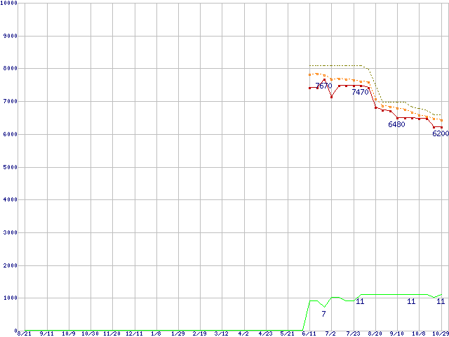 Athlon II X2 260 (3.2GHz,L2 1MB×2,TDP 65W)の価格推移↑前グラフ↓次グラフ(2009年8月21日〜2010年10月29日)※このグラフは過去のデータも税率5%相当に調整した税込み相当額のグラフです。●関連グラフCPU主要製品の最安値推移CPU主要製品(最安値1万円未満)の最安値推移AMD系CPUの最安値推移Socket AM3 (Dual Core)の最安値推移●凡例最安値(点線部は販売店未確認または未調査)平均値最高値ショップ数