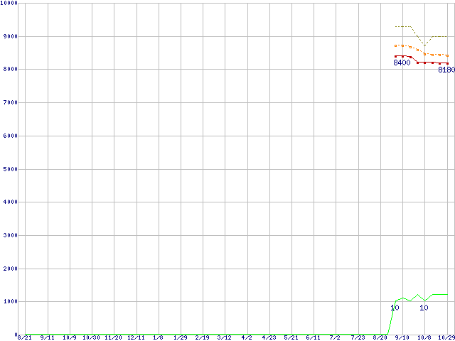 Pentium E6800 (3.33GHz,L2 2MB)の価格推移↑前グラフ↓次グラフ(2009年8月21日〜2010年10月29日)※このグラフは過去のデータも税率5%相当に調整した税込み相当額のグラフです。●関連グラフCPU主要製品の最安値推移CPU主要製品(最安値1万円未満)の最安値推移Intel系CPUの最安値推移LGA775 (FSB 1066MHz,Dual Core,TDP 65W)の最安値推移●凡例最安値(点線部は販売店未確認または未調査)平均値最高値ショップ数