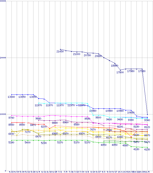 CPU主要製品(最安値1万円未満)の最安値推移↑前グラフ↓次グラフ(2010年4月23日〜2010年11月5日)※このグラフは過去のデータも税率5%相当に調整した税込み相当額のグラフです。凡例Phenom II X6 1055T (2.8GHz,L2 512KB×6,L3 6MB,TDP 95W)Phenom II X4 900e (2.4GHz,L2 512KB×4,L3 6MB,TDP 65W)Core i3-540 (3.06GHz)Phenom II X2 560 Black Edition (3.3GHz,L2 512KB×2,L3 6MB)Athlon II X4 640 (3.0GHz,L2 512KB×4,TDP 95W)Pentium G6950 (2.8GHz)Phenom II X2 555 Black Edition (3.2GHz,L2 512KB×2,L3 6MB)Pentium E6800 (3.33GHz,L2 2MB)Pentium E6700 (3.20GHz,L2 2MB)Athlon II X3 445 (3.1GHz,L2 512KB×3,TDP 95W)Athlon II X2 250e (3.0GHz,L2 1MB×2,TDP 45W)Pentium E6600 (3.06GHz,L2 2MB)Athlon II X2 265 (3.3GHz,L2 1MB×2,TDP 65W)Pentium E6500 (2.93GHz,L2 2MB)Athlon II X2 245e (2.9GHz,L2 1MB×2,TDP 45W)Athlon II X2 260 (3.2GHz,L2 1MB×2,TDP 65W)Athlon II X2 255 (3.1GHz,L2 1MB×2,TDP 65W)Athlon II X2 240e (2.8GHz,L2 1MB×2,TDP 45W)Athlon II X2 250 (3.0GHz,L2 1MB×2,TDP 65W)Celeron E3500 (2.7GHz)Celeron E3400 (2.6GHz)※製品名をクリックすると個別のグラフを表示します※点線部は販売店が確認できなかった、または調査データがないことを示します