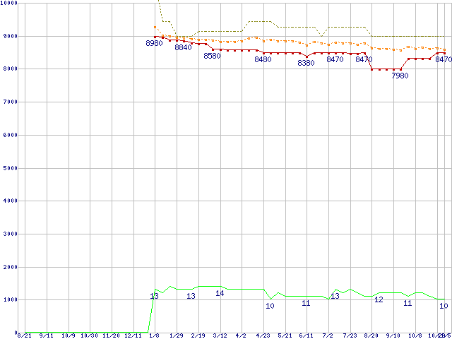 Pentium G6950 (2.8GHz)の価格推移↑前グラフ↓次グラフ(2009年8月21日〜2010年11月5日)※このグラフは過去のデータも税率5%相当に調整した税込み相当額のグラフです。●関連グラフCPU主要製品の最安値推移CPU主要製品(最安値1万円未満)の最安値推移Intel系CPUの最安値推移LGA1156 (L3キャッシュ3MB,Dual Core,GPU内蔵,TDP 73W)の最安値推移●凡例最安値(点線部は販売店未確認または未調査)平均値最高値ショップ数