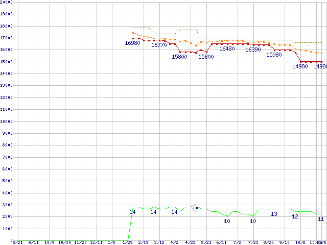 Phenom II X4 910e (2.6GHz,L2 512KB×4,L3 6MB,TDP 65W)の価格推移↑前グラフ↓次グラフ(2009年8月21日〜2010年11月5日)※このグラフは過去のデータも税率5%相当に調整した税込み相当額のグラフです。●関連グラフCPU主要製品の最安値推移CPU主要製品(最安値1万円〜2万円未満)の最安値推移AMD系CPUの最安値推移Socket AM3 (HyperTransport 3.0,Quad Core)の最安値推移●凡例最安値(点線部は販売店未確認または未調査)平均値最高値ショップ数