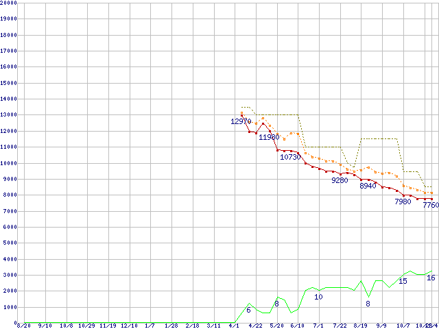 WD7500BPVT (750GB,8MB)の価格推移↑前グラフ↓次グラフ(2009年8月20日〜2010年11月4日)※このグラフは過去のデータも税率5%相当に調整した税込み相当額のグラフです。●関連グラフHDD/SSD主要製品の最安値推移HDD/SSD主要製品(最安値1万円未満)の最安値推移HDD 750GB〜1TB未満の最安値推移WD Scorpio Blue (5200〜5400rpm,3Gb/s,2.5インチ)の最安値推移●凡例最安値(点線部は販売店未確認または未調査)平均値最高値ショップ数