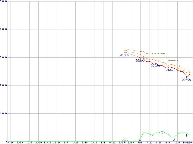 WD6000HLHX (600.0GB)の価格推移↓次グラフ(2009年8月20日〜2010年11月4日)※このグラフは過去のデータも税率5%相当に調整した税込み相当額のグラフです。●関連グラフHDD/SSD主要製品の最安値推移HDD/SSD主要製品(最安値2万円以上)の最安値推移HDD 600〜750GB未満の最安値推移WD VelociRaptor (10000rpm,6Gb/s,16MB)の最安値推移●凡例最安値(点線部は販売店未確認または未調査)平均値最高値ショップ数