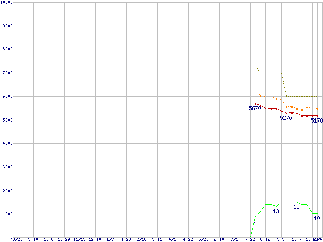 0S02601(純正パッケージ品) (1TB,32MB)の価格推移↑前グラフ↓次グラフ(2009年8月20日〜2010年11月4日)※このグラフは過去のデータも税率5%相当に調整した税込み相当額のグラフです。●関連グラフHDD/SSD主要製品の最安値推移HDD/SSD主要製品(最安値1万円未満)の最安値推移HDD 1TB〜1.5TB未満の最安値推移DESKSTAR (7200rpm,3Gb/s)の最安値推移●凡例最安値(点線部は販売店未確認または未調査)平均値最高値ショップ数