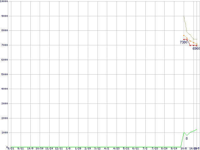 Athlon II X2 250e (3.0GHz,L2 1MB×2,TDP 45W)の価格推移↑前グラフ↓次グラフ(2009年8月21日〜2010年11月5日)※このグラフは過去のデータも税率5%相当に調整した税込み相当額のグラフです。●関連グラフCPU主要製品の最安値推移CPU主要製品(最安値1万円未満)の最安値推移AMD系CPUの最安値推移Socket AM3 (Dual Core)の最安値推移●凡例最安値(点線部は販売店未確認または未調査)平均値最高値ショップ数