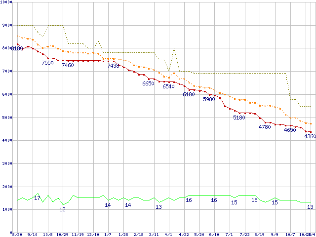 WD5000BEVT (500GB,8MB)の価格推移↑前グラフ↓次グラフ(2009年8月20日〜2010年11月4日)※このグラフは過去のデータも税率5%相当に調整した税込み相当額のグラフです。●関連グラフHDD/SSD主要製品の最安値推移HDD/SSD主要製品(最安値1万円未満)の最安値推移HDD 500〜600GB未満の最安値推移WD Scorpio Blue (5200〜5400rpm,3Gb/s,2.5インチ)の最安値推移●凡例最安値(点線部は販売店未確認または未調査)平均値最高値ショップ数