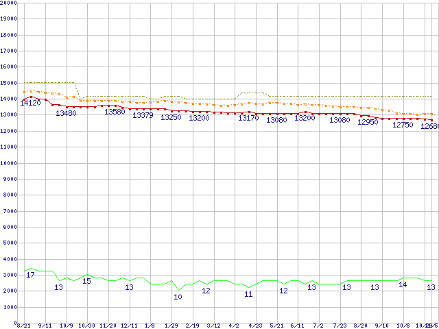 Core 2 Duo E7600 (3.06GHz,L2 3MB)の価格推移↑前グラフ↓次グラフ(2009年8月21日〜2010年11月5日)※このグラフは過去のデータも税率5%相当に調整した税込み相当額のグラフです。●関連グラフCPU主要製品の最安値推移CPU主要製品(最安値1万円〜2万円未満)の最安値推移Intel系CPUの最安値推移LGA775 (FSB 1066MHz,Dual Core,TDP 65W)の最安値推移●凡例最安値(点線部は販売店未確認または未調査)平均値最高値ショップ数