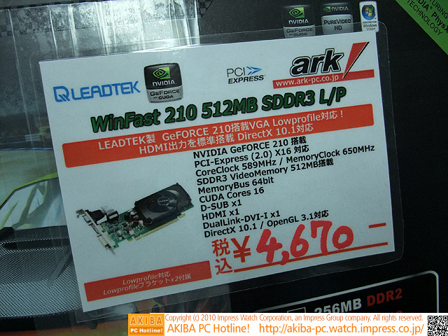 ![]() | AKIBA PC Hotline! 2010年11月6日号 今週見つけた新製品:ビデオカード [拡大画像]Leadtek WinFast 210 512MB SDDR3 L/P(WF 210 512MB SDDR3 L/P) |