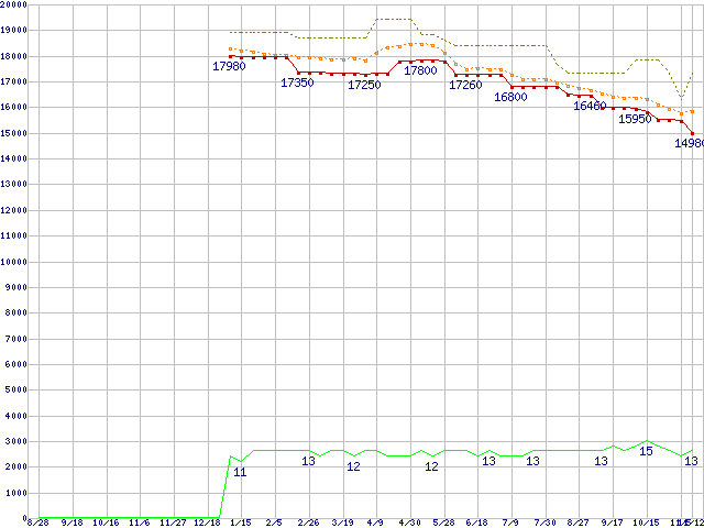Core i5-650 (3.2GHz)の価格推移↑前グラフ↓次グラフ(2009年8月28日〜2010年11月12日)※このグラフは過去のデータも税率5%相当に調整した税込み相当額のグラフです。●関連グラフCPU主要製品の最安値推移CPU主要製品(最安値1万円〜2万円未満)の最安値推移Intel系CPUの最安値推移LGA1156 (L3キャッシュ4MB,Dual Core,GPU内蔵,Hyper-Threading,TDP 73〜87W)の最安値推移●凡例最安値(点線部は販売店未確認または未調査)平均値最高値ショップ数