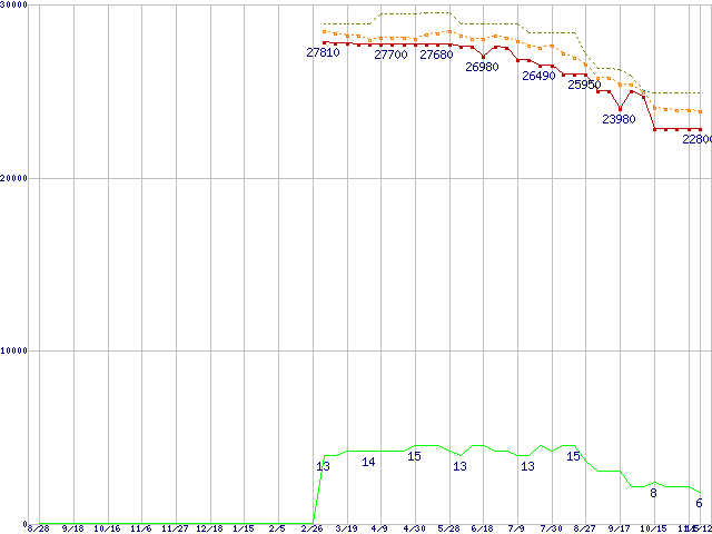 Core i7-930 (2.80GHz)の価格推移↑前グラフ↓次グラフ(2009年8月28日〜2010年11月12日)※このグラフは過去のデータも税率5%相当に調整した税込み相当額のグラフです。●関連グラフCPU主要製品の最安値推移CPU主要製品(最安値2万円〜3万円未満)の最安値推移Intel系CPUの最安値推移LGA1366 (QPI 4.8GT/s,L3キャッシュ8MB,Quad Core,Hyper-Threading,TDP 130W)の最安値推移●凡例最安値(点線部は販売店未確認または未調査)平均値最高値ショップ数