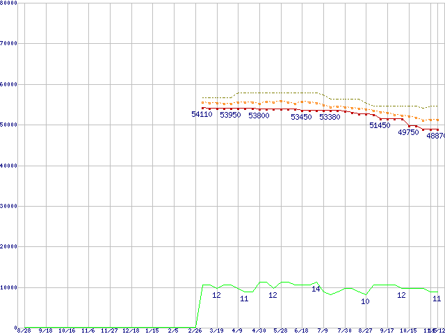 Core i7-960 (3.20GHz)の価格推移↑前グラフ↓次グラフ(2009年8月28日〜2010年11月12日)※このグラフは過去のデータも税率5%相当に調整した税込み相当額のグラフです。●関連グラフCPU主要製品の最安値推移CPU主要製品(最安値3万円〜6万円未満)の最安値推移Intel系CPUの最安値推移LGA1366 (QPI 4.8GT/s,L3キャッシュ8MB,Quad Core,Hyper-Threading,TDP 130W)の最安値推移●凡例最安値(点線部は販売店未確認または未調査)平均値最高値ショップ数