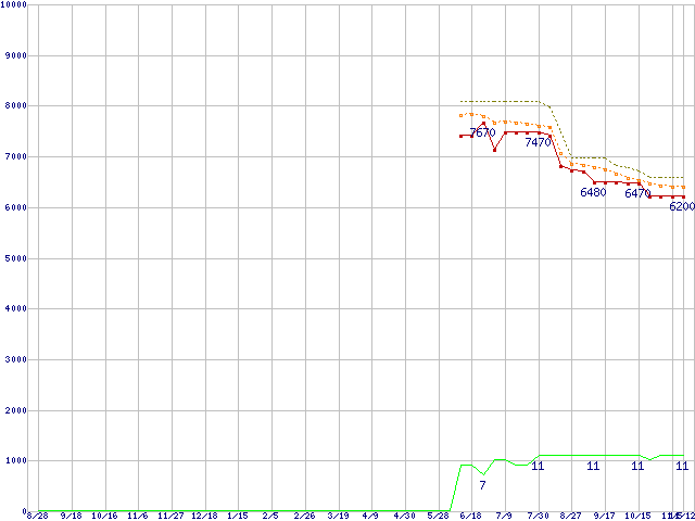 Athlon II X2 260 (3.2GHz,L2 1MB×2,TDP 65W)の価格推移↑前グラフ↓次グラフ(2009年8月28日〜2010年11月12日)※このグラフは過去のデータも税率5%相当に調整した税込み相当額のグラフです。●関連グラフCPU主要製品の最安値推移CPU主要製品(最安値1万円未満)の最安値推移AMD系CPUの最安値推移Socket AM3 (Dual Core)の最安値推移●凡例最安値(点線部は販売店未確認または未調査)平均値最高値ショップ数
