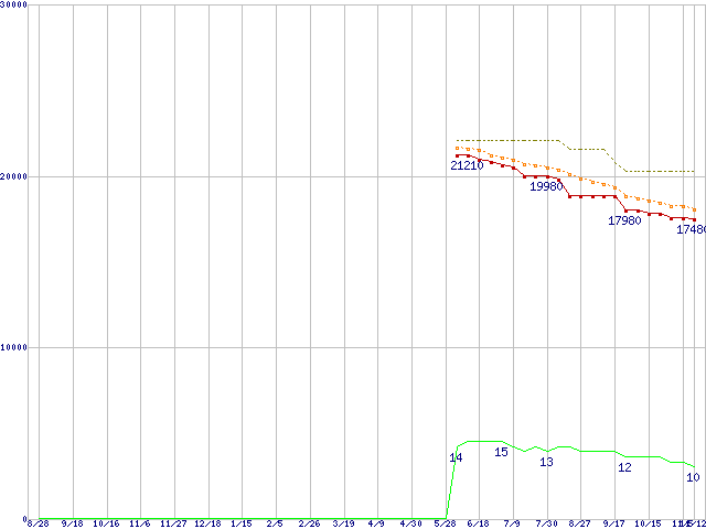 Core i5-655K (3.2GHz)の価格推移↑前グラフ↓次グラフ(2009年8月28日〜2010年11月12日)※このグラフは過去のデータも税率5%相当に調整した税込み相当額のグラフです。●関連グラフCPU主要製品の最安値推移CPU主要製品(最安値1万円〜2万円未満)の最安値推移Intel系CPUの最安値推移LGA1156 (L3キャッシュ4MB,Dual Core,GPU内蔵,Hyper-Threading,TDP 73〜87W)の最安値推移●凡例最安値(点線部は販売店未確認または未調査)平均値最高値ショップ数