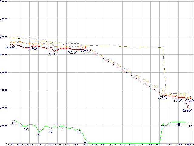 Core i7-950 (3.06GHz)の価格推移↑前グラフ↓次グラフ(2009年8月28日〜2010年11月12日)※このグラフは過去のデータも税率5%相当に調整した税込み相当額のグラフです。●関連グラフCPU主要製品の最安値推移CPU主要製品(最安値2万円〜3万円未満)の最安値推移Intel系CPUの最安値推移LGA1366 (QPI 4.8GT/s,L3キャッシュ8MB,Quad Core,Hyper-Threading,TDP 130W)の最安値推移●凡例最安値(点線部は販売店未確認または未調査)平均値最高値ショップ数