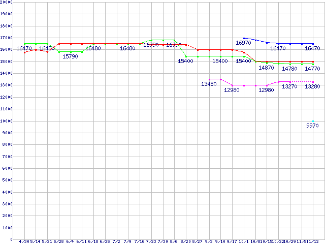 Socket AM3 (HyperTransport 3.0,Quad Core)の最安値推移↑前グラフ↓次グラフ(2010年4月30日〜2010年11月12日)※このグラフは過去のデータも税率5%相当に調整した税込み相当額のグラフです。凡例Phenom II X4 970 Black Edition (3.5GHz,L2 512KB×4,L3 6MB,TDP 125W)Phenom II X4 910e (2.6GHz,L2 512KB×4,L3 6MB,TDP 65W)Phenom II X4 965 Black Edition (3.4GHz,L2 512KB×4,L3 6MB,TDP 125W)Phenom II X4 955 (3.2GHz,L2 512KB×4,L3 6MB,TDP 95W)Phenom II X4 900e (2.4GHz,L2 512KB×4,L3 6MB,TDP 65W)※製品名をクリックすると個別のグラフを表示します※点線部は販売店が確認できなかった、または調査データがないことを示します