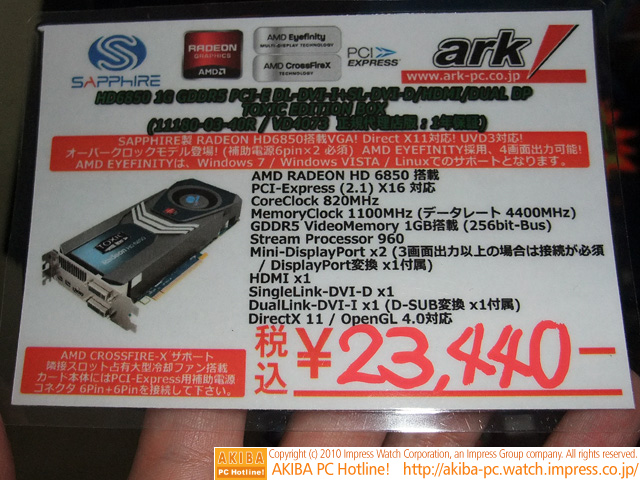 ![]() | AKIBA PC Hotline! 2010年11月20日号 今週見つけた新製品:ビデオカード [拡大画像]SAPPHIRE TOXIC HD6850 1G GDDR5 PCI-E DL-DVI-I+SL-DVI-D/HDMI/DUAL MINI DP |
