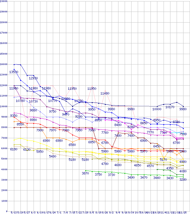 HDD/SSD主要製品(最安値1万円未満)の最安値推移↑前グラフ↓次グラフ(2010年5月13日〜2010年11月25日)※このグラフは過去のデータも税率5%相当に調整した税込み相当額のグラフです。凡例HDS722020ALA330 (2TB,32MB)WD10TPVT (1TB,8MB,12.5mm厚)ST32000542AS (2TB,32MB)WD20EARS (2TB,64MB)HTS547575A9E384 (750GB,8MB)その他2.5インチSSD 64GB (64GB,MLC)HD204UI (2TB,32MB)WD1002FAEX (1TB,64MB)WD7500BPVT (750GB,8MB)その他2.5インチSSD 32GB (32GB,MLC)HTS547564A9E384 (640GB,8MB)WD6400BPVT (640GB,8MB)WD15EARS (1.5TB,64MB)WD10EALX (1TB,32MB)0S02601(純正パッケージ品) (1TB,32MB)ST31000528AS (1TB,32MB)WD10EARS (1TB,64MB)0S02598 (500GB,8MB)WD5000BEVT (500GB,8MB)WD5000AAKX (500GB)0S02600(純正パッケージ品) (500GB,16MB)※製品名をクリックすると個別のグラフを表示します※点線部は販売店が確認できなかった、または調査データがないことを示します
