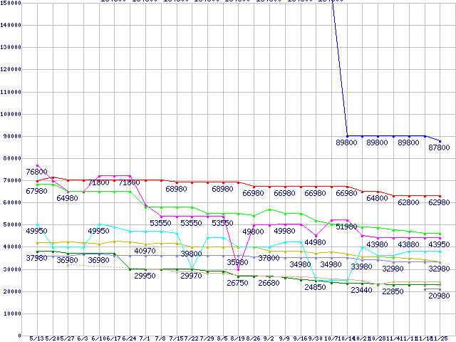HDD/SSD主要製品(最安値2万円以上)の最安値推移↑前グラフ(2010年5月13日〜2010年11月25日)※このグラフは過去のデータも税率5%相当に調整した税込み相当額のグラフです。凡例その他2.5インチSSD 512GB (512GB,MLC)SSDSA2SH064G1C5 (64GB,SLC)CTFDDAC256MAG-1G1 (256GB,MLC)2.5インチSSD(SandForce製コントローラ) (200〜240GB,MLC)その他2.5インチSSD 256GB (256GB,MLC)X25-M(G2) (160GB,MLC)SSDSA2SH032G1 (32GB,SLC)WD6000HLHX (600.0GB)CTFDDAC128MAG-1G1 (128GB,MLC)WD30EZRS (3TB,64MB)HDS723030ALA640 (3TB,64MB)※製品名をクリックすると個別のグラフを表示します※点線部は販売店が確認できなかった、または調査データがないことを示します