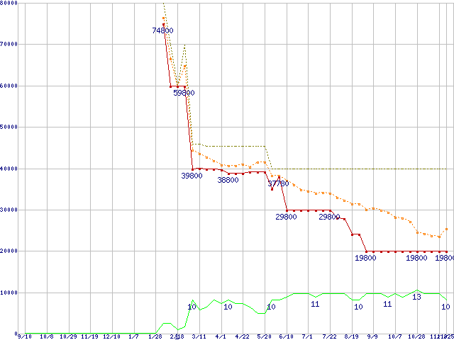 2.5インチSSD(SandForce製コントローラ) (100〜120GB,MLC)の価格推移↑前グラフ↓次グラフ(2009年9月10日〜2010年11月25日)※このグラフは過去のデータも税率5%相当に調整した税込み相当額のグラフです。●関連グラフHDD/SSD主要製品の最安値推移HDD/SSD主要製品(最安値1万5千円〜2万円未満)の最安値推移HDD 100〜160GB未満の最安値推移2.5インチSSD (SSD,3Gbps,2.5インチ)の最安値推移●凡例最安値(点線部は販売店未確認または未調査)平均値最高値ショップ数