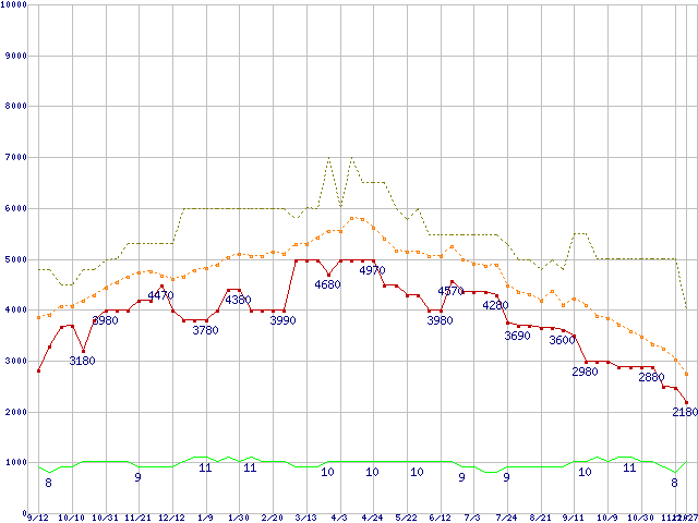 PC3-10600 2GBの価格推移↑前グラフ↓次グラフ(2009年9月12日〜2010年11月27日)※このグラフは過去のデータも税率5%相当に調整した税込み相当額のグラフです。●関連グラフメモリ主要製品の最安値推移2GBモジュール/1GBモジュール×2枚の最安値推移メモリ主要製品(最安値5千円未満)の最安値推移PC3-10600(DDR3-1333) DDR3 SDRAM DIMMの最安値推移●凡例最安値(点線部は販売店未確認または未調査)平均値最高値ショップ数