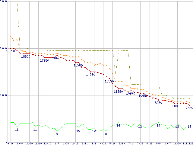 ST32000542AS (2TB,32MB)の価格推移↑前グラフ↓次グラフ(2009年9月10日〜2010年11月25日)※このグラフは過去のデータも税率5%相当に調整した税込み相当額のグラフです。●関連グラフHDD/SSD主要製品の最安値推移HDD/SSD主要製品(最安値1万円未満)の最安値推移HDD 2TB以上の最安値推移Barracuda LP (5900rpm,3Gb/s)の最安値推移●凡例最安値(点線部は販売店未確認または未調査)平均値最高値ショップ数