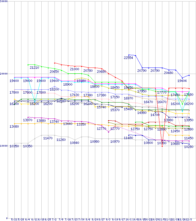 CPU主要製品(最安値1万円〜2万円未満)の最安値推移↑前グラフ↓次グラフ(2010年5月21日〜2010年12月3日)※このグラフは過去のデータも税率5%相当に調整した税込み相当額のグラフです。凡例Phenom II X6 1075T (3.0GHz,L2 512KB×6,L3 6MB,TDP 125W)Phenom II X6 1055T (2.8GHz,L2 512KB×6,L3 6MB,TDP 95W)Core i5-655K (3.2GHz)Core i5-661 (3.33GHz)Core i5-660 (3.33GHz)Core i5-760 (2.8GHz)Core 2 Duo E8500 (3.16GHz,L2 6MB)Phenom II X4 970 Black Edition (3.5GHz,L2 512KB×4,L3 6MB,TDP 125W)Phenom II X4 910e (2.6GHz,L2 512KB×4,L3 6MB,TDP 65W)Core i5-650 (3.2GHz)Core 2 Duo E8400 (3GHz,L2 6MB)Phenom II X4 965 Black Edition (3.4GHz,L2 512KB×4,L3 6MB,TDP 125W)Core 2 Quad Q8400 (2.66GHz,L2 2MB×2)Phenom II X4 955 (3.2GHz,L2 512KB×4,L3 6MB,TDP 95W)Athlon II X4 615e (2.5GHz,L2 512KB×4,TDP 45W)Core i3-560 (3.33GHz)Core 2 Duo E7600 (3.06GHz,L2 3MB)Core i3-550 (3.20GHz)Core 2 Duo E7500 (2.93GHz,L2 3MB)Athlon II X4 645 (3.1GHz,L2 512KB×4,TDP 95W)※製品名をクリックすると個別のグラフを表示します※点線部は販売店が確認できなかった、または調査データがないことを示します