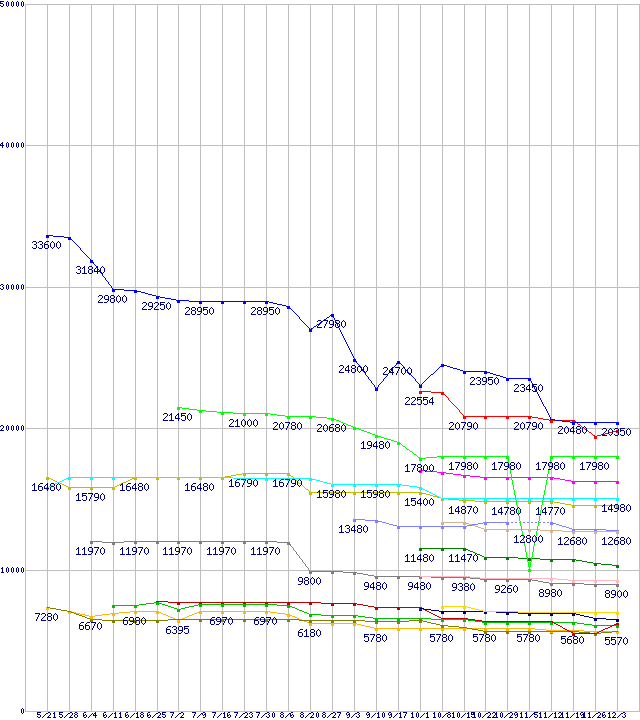 AMD系CPUの最安値推移↑前グラフ↓次グラフ(2010年5月21日〜2010年12月3日)※このグラフは過去のデータも税率5%相当に調整した税込み相当額のグラフです。凡例Phenom II X6 1090T Black Edition (3.2GHz,L2 512KB×6,L3 6MB,TDP 125W)Phenom II X6 1075T (3.0GHz,L2 512KB×6,L3 6MB,TDP 125W)Phenom II X6 1055T (2.8GHz,L2 512KB×6,L3 6MB,TDP 95W)Phenom II X4 970 Black Edition (3.5GHz,L2 512KB×4,L3 6MB,TDP 125W)Phenom II X4 910e (2.6GHz,L2 512KB×4,L3 6MB,TDP 65W)Phenom II X4 965 Black Edition (3.4GHz,L2 512KB×4,L3 6MB,TDP 125W)Phenom II X4 955 (3.2GHz,L2 512KB×4,L3 6MB,TDP 95W)Athlon II X4 615e (2.5GHz,L2 512KB×4,TDP 45W)Athlon II X4 645 (3.1GHz,L2 512KB×4,TDP 95W)Phenom II X2 560 Black Edition (3.3GHz,L2 512KB×2,L3 6MB)Athlon II X4 640 (3.0GHz,L2 512KB×4,TDP 95W)Athlon II X2 250e (3.0GHz,L2 1MB×2,TDP 45W)Athlon II X2 265 (3.3GHz,L2 1MB×2,TDP 65W)Athlon II X2 245e (2.9GHz,L2 1MB×2,TDP 45W)Athlon II X2 260 (3.2GHz,L2 1MB×2,TDP 65W)Athlon II X2 240e (2.8GHz,L2 1MB×2,TDP 45W)Athlon II X2 255 (3.1GHz,L2 1MB×2,TDP 65W)※製品名をクリックすると個別のグラフを表示します※点線部は販売店が確認できなかった、または調査データがないことを示します